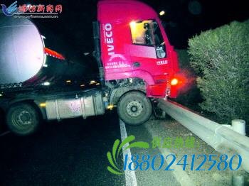 1月15日凌晨,在青银高速潍坊段青岛方向143公里+800米处,一辆货车水箱出现故障,,正准备行驶到应急车道停车检修,后面的一辆油罐车刹车不及与其发生刮蹭,油罐车失控后又撞向了中央护栏(如图)。所幸油罐车是一辆空车,货车受损也不严重,事故没有人员伤亡。山东高速潍坊路政大队接到报警后,及时赶到现场进行了处置。目前此次事故的具体原因还在进一步调查之中。