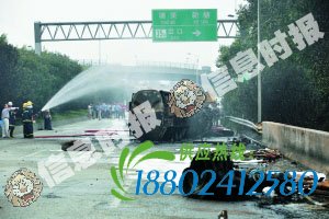 由于油罐车内载有易燃易爆液体,消防员一直向车身浇水降温。信息时报记者 叶伟报 摄