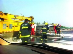 警方介绍,侧翻的是一辆运载柴油的罐车,事发时是空载,但罐内仍有残存的柴油,存在一定危险性,下午2点半左右,吊车赶到现场,消防队员向罐车喷洒泡沫后,吊车将罐车扶正拖走。