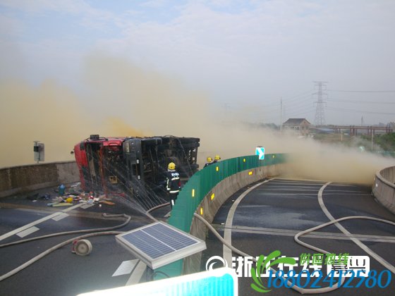 浙江在线嘉兴频道09月21日讯(通讯员 杨晓马、盛琴华、洪轶巍)9月21日凌晨,浙江嘉兴嘉绍(G15W常台)高速公路上发生一起危化品货车翻车事故,车上28吨挥发性浓硝酸发生部分泄漏,消防、安监、公安、环保等部门、耗时近5个小时,成功处置了一起货车翻车而引发的危化品泄露事故,未造成周边环境的严重影响。